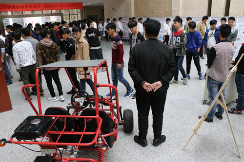 启动仪式结束后,师生代表们参观了学校“双创”活动的宣传展板,了解了学生创新创业的政策、法规、程序、途径,并欣赏了思维智能代步车、便移可锁省空间教学桌椅机、多功能手工成形降噪抗震工作台等创新创业大赛参赛作品。