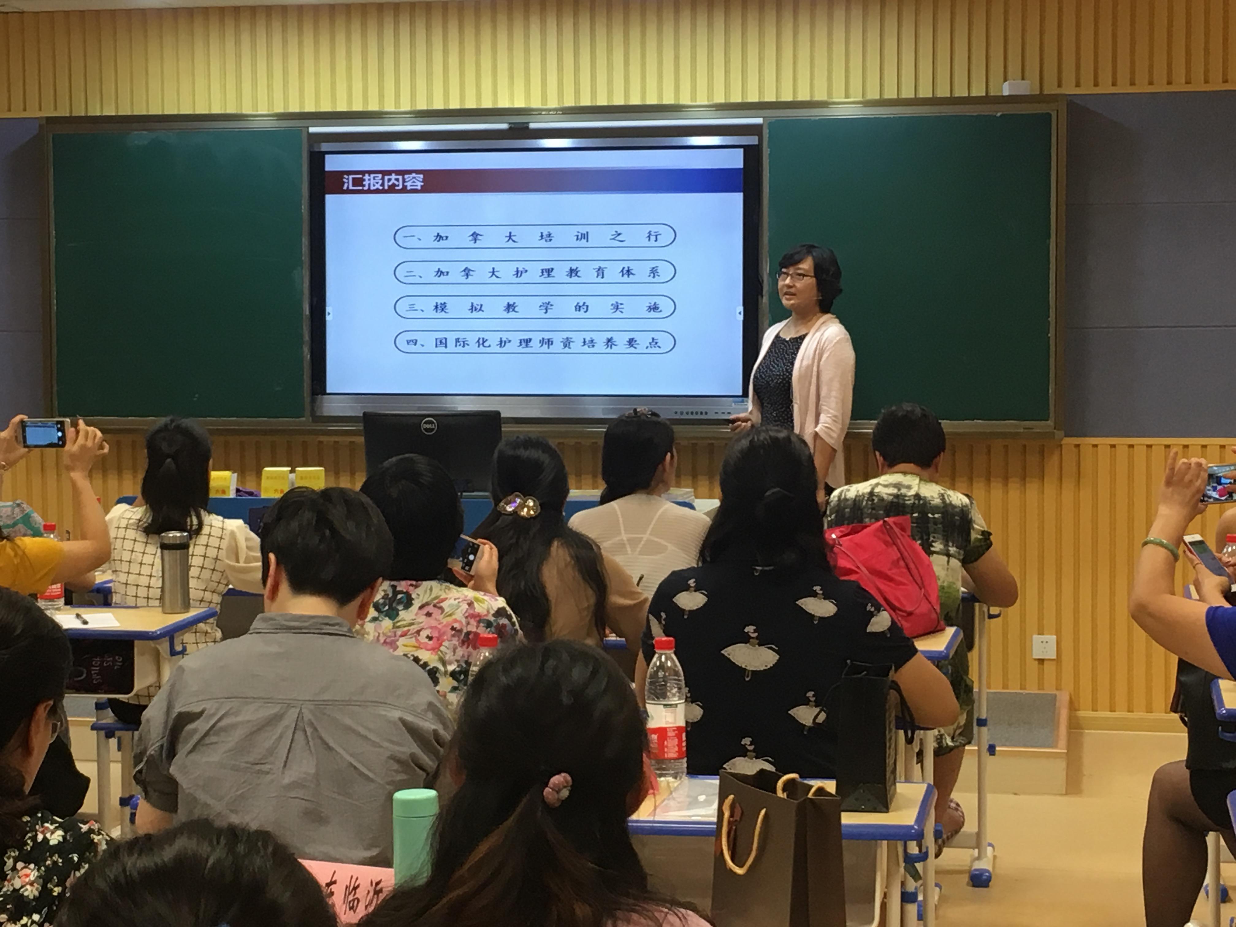 天津医学高等专科学校王芃主任代表参加2017年7月加拿大课题调研和师资培训的全体教师对“如何申请成为加拿大LPN教学与考试基地”的建设路径与方法、国际化人才培养方案等内容进行了汇报。雅思学习平台的老师介绍了测评系统、功能和使用方法。上海交通大学护理学院执行院长章雅青教授做了题为“以案例为本的教学改革与实践”的讲座。北京大学护理学院万巧琴副教做了题为“护理的改革与发展展望”的讲座。培训还特邀和睦家医院人事总监李采兰和加拿大圣力嘉学院(Seneca College)的护理专家Sharon R. Cassar远程直播授课。李总监作了“英语护士在和睦家医院的使用和发展”报告,Sharon围绕着“国内外学分互认课程”,从国际课程如何教学、如何制定课程大纲、如何运用混合式护理教学方法等方面进行系统培训。