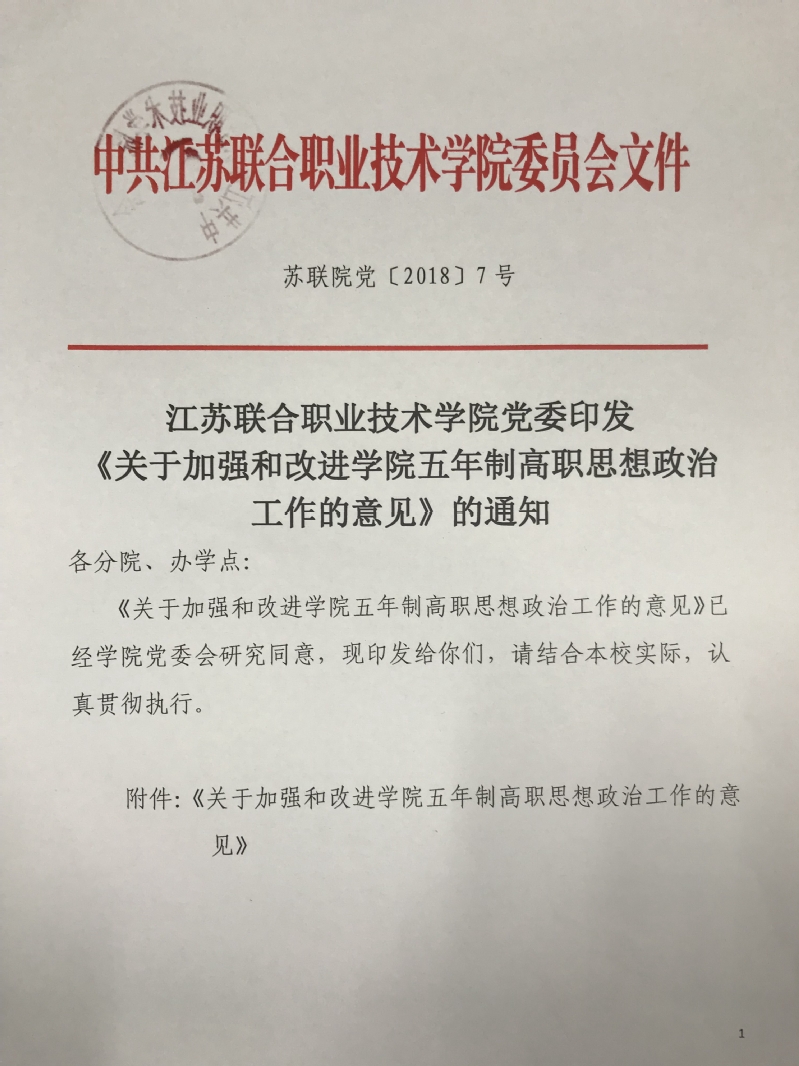 江苏联合职业技术学院党委印发《关于加强和改进学院五年制高职思想政治工作的意见》的通知