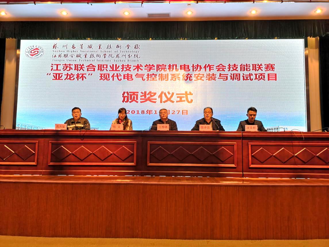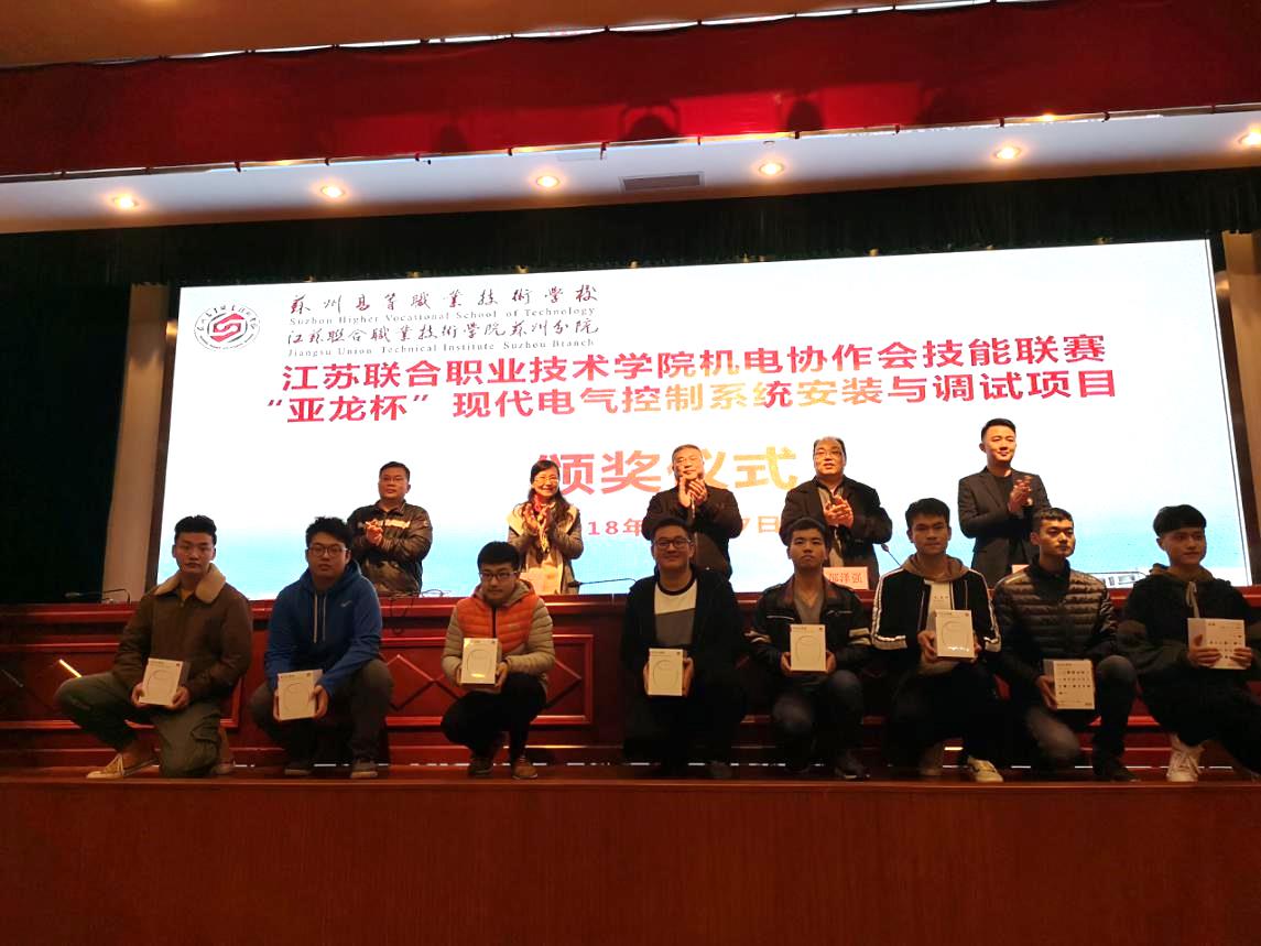 赛后举办的颁奖仪式由学院机电类专业协作会秘书长无锡机电分院教务主任邵泽强教授主持,苏州分院万烨锋校长致辞。万校长对亲临竞赛现场指导的各位领导和各参赛队伍的领队、指导教师、参赛选手表示热烈的欢迎!向对本次比赛予以大力支持的亚龙公司表示衷心的感谢!向为大赛付出辛勤劳动的全体工作人员致以诚挚的慰问!他认为本次联赛是一个发现人才、挖掘人才和培养人才的重要途径,也是职业院校沟通交流、共同发展的桥梁,更是职业教育实现内涵发展的重要途径。无锡交通分院机电学院院长范次猛教授对本次大赛进行了点评,他认为本次比赛的规模大、参赛学校多,参赛选手的职业素养、安全意识比较好,操作技能水平较高。学院学生管理处伍文老师对本次比赛予以了高度的肯定,组织工作有条不紊,赛场井然有序,评判公平、公正,对大家的积极参与给予赞赏。并希望各学校通过本次比赛自我进行总结,不断提升技能教学水平,提高参赛水平,在高职院校技能大赛中取得好成绩。对苏州分院精心承办此次联赛,对亚龙智能装备有限公司在技术保障、设备保障、学生奖品给与大力支持表示感谢。亚龙公司江苏总监沈贵祥出席了颁奖仪式。