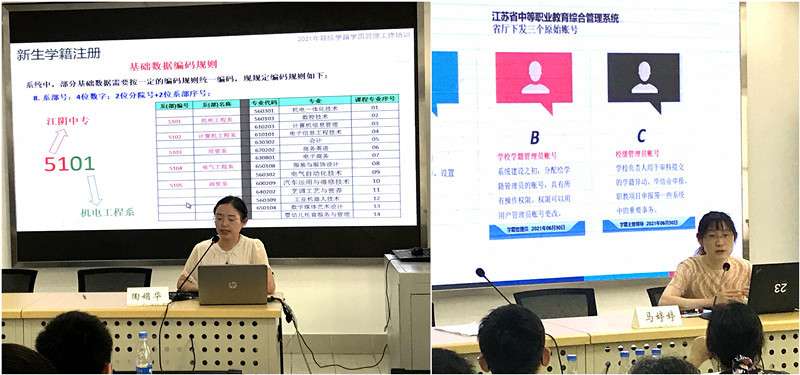 接着,南京分院马婷婷老师和江阴中专办学点陶娟华老师讲解了省中职系统和学院学生管理信息系统的操作规范,现场演练了管理系统的具体操作。学生管理处刘媛老师还就学籍学历管理的相关规定在执行中出现的常见问题,进行了归纳和解答。