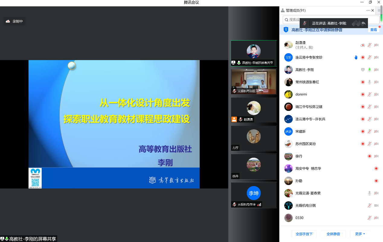 5月26日上午9点,学院智能控制专业建设指导委员会根据工作安排,线上召开了课程思政建设与教材建设培训研讨会。会议主会场设在无锡机电分院智慧会议室,专指委主任委员、无锡机电分院蔡军校长,副主任委员、无锡机电分院莫剑中副校长,高等教育出版社高级编辑王佳玮老师,首席策划编辑李刚老师,专指委成员单位委员和“十四五”院本教材编写团队全体成员共97人参加了会议。