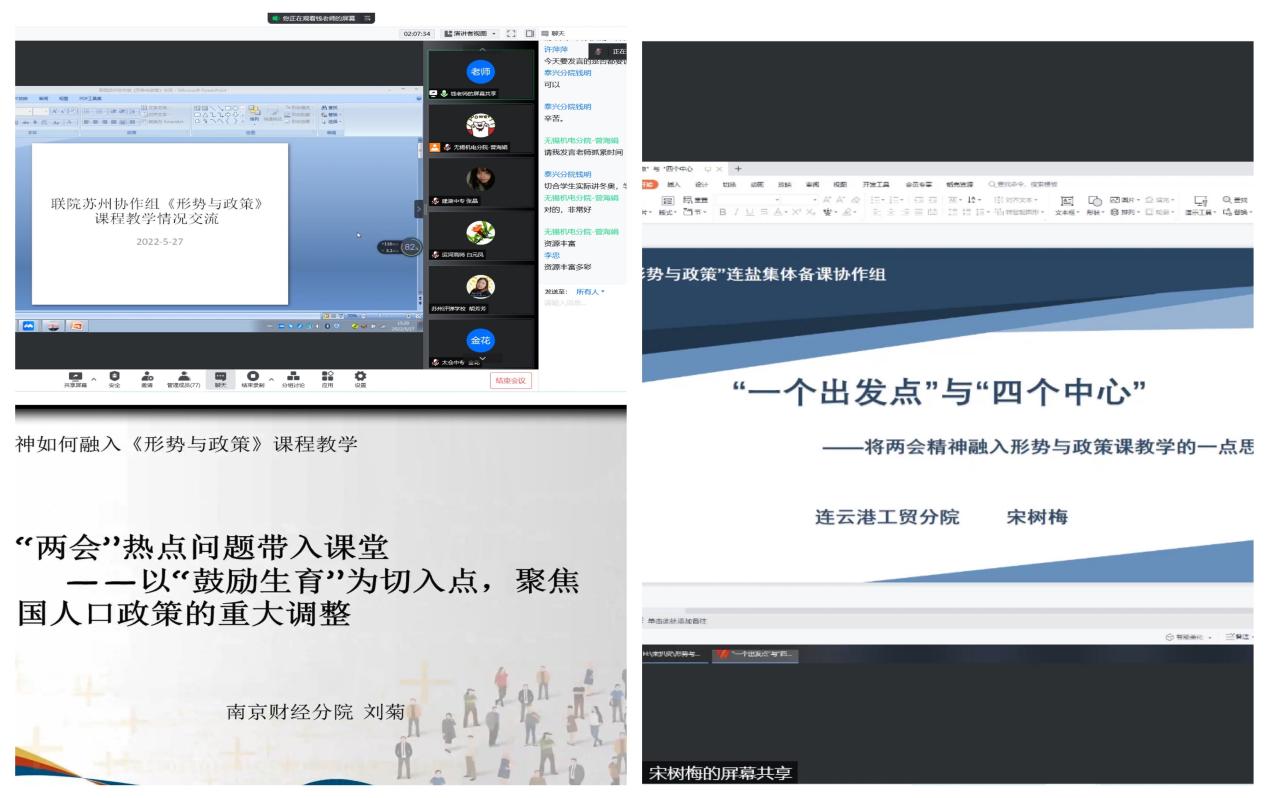 苏州协作组钱东鹰老师紧紧围绕本协作组的实际情况,从苏州各校课程开设情况、经验和困难以及一个月以来的集体备课情况展开交流。连盐协作组宋树梅老师以《“一个出发点”与“四个中心”——将两会精神融入形势与政策课教学的一点思考》为主题,强调以学生为出发点,贯穿于知情意行四个方面,实现传授知识、唤醒使命、行动落地的教学目标。南京协作组刘菊老师以《把“两会”热点问题带入课堂——以“鼓励生育”为切入点,聚焦我国人口政策调整》为主题做课例展示,采用数据说理、小组探究等手段清晰解读我国人口政策,形成良好的课堂互动,发挥学生主体作用。