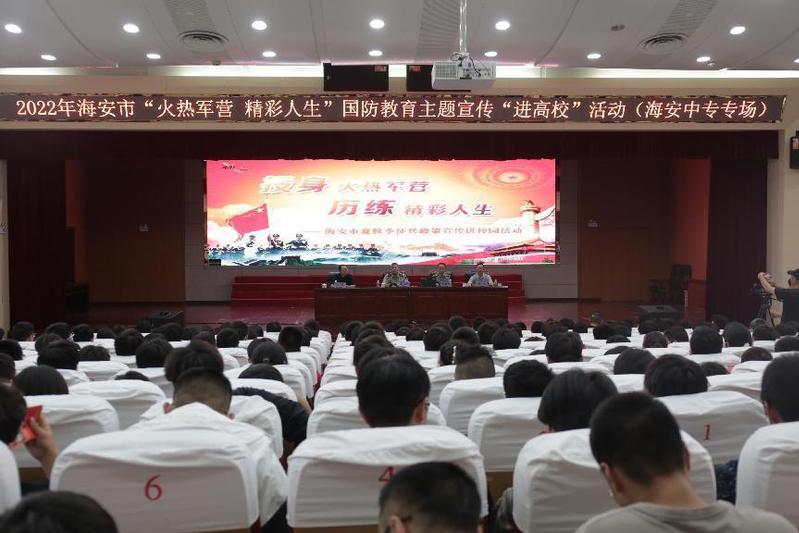 6月15日,海安市2022年“火热军营,精彩人生”国防教育主题宣传“进高校”活动在海安中专图文信息大楼二楼报告厅隆重举行。市委常委、人武部政委夏鹏飞,市人武部副部长张前进,市教体局职社科副科长徐健,校党委委员、副校长张兵,学生处及系部管理人员出席会议。600多名大专学生参加会议。