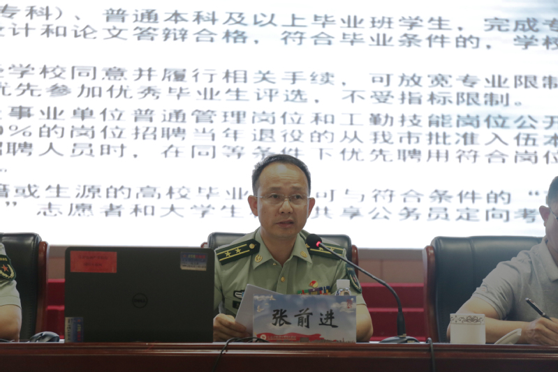 张兵主持会议。 张前进向同学们作征兵政策宣讲,指出征兵工作是治国安邦的大事,是加强国防和军队建设的迫切需要。同时,参军入伍也是每一个符合要求的应征青年的责任和义务。