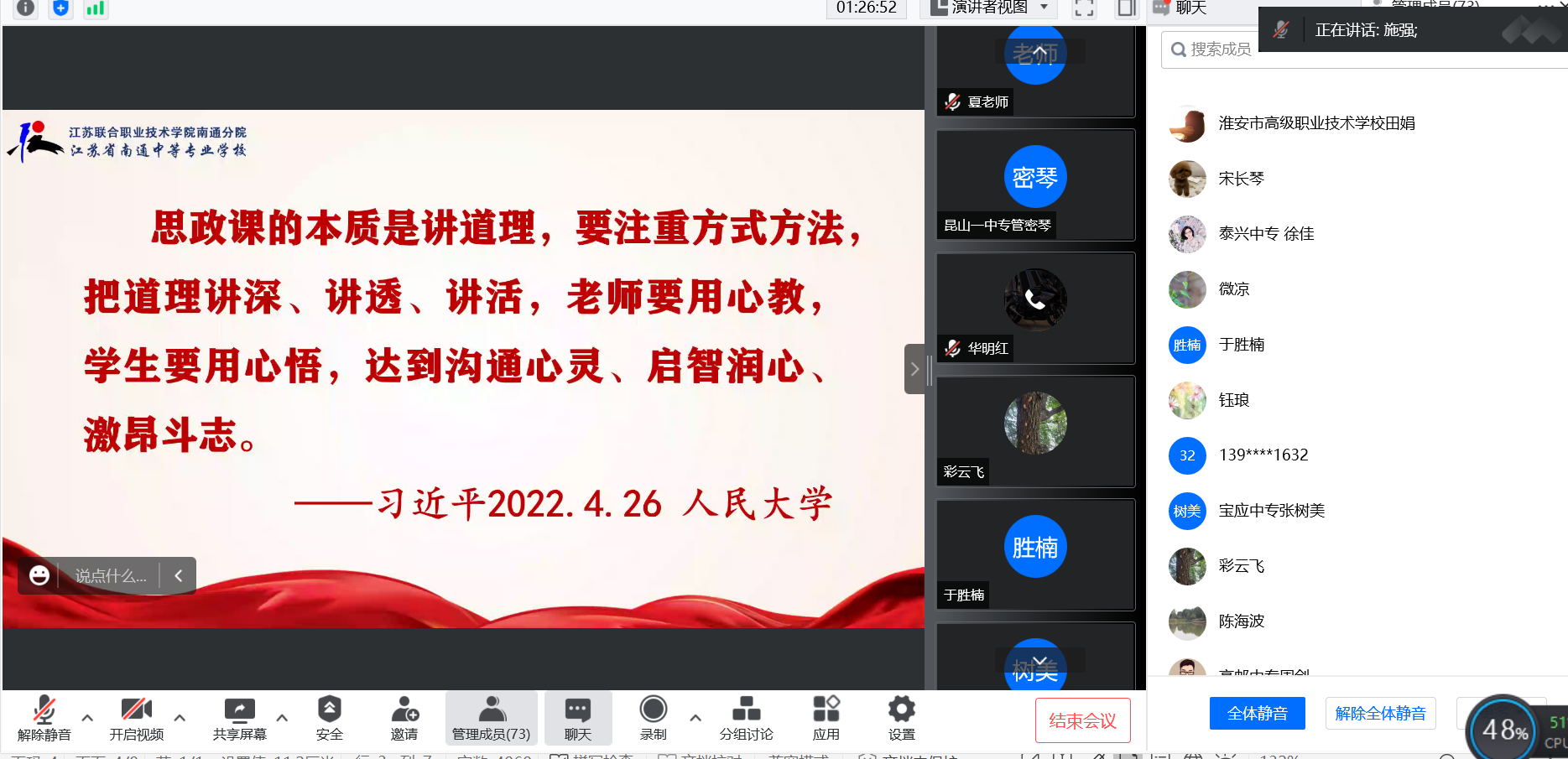 各个协作组教师代表针对日常教学存在的重点、难点和热点问题,进行交流发言和经验分享。苏州协作组乔欢老师就如何提升思政课实效性的途径探析进行交流,南京协作组王亚婷老师分享了对课程思政与思政课程同向同行的实践探索,淮宿扬协作组张雷老师分享了提升思政课吸引力的策略,通泰协作组施强老师示范如何将北京冬奥精神融入课程教学环节。各位老师的交流发言紧扣思政课新课标,对如何上好思政课进行了深入的思考。
