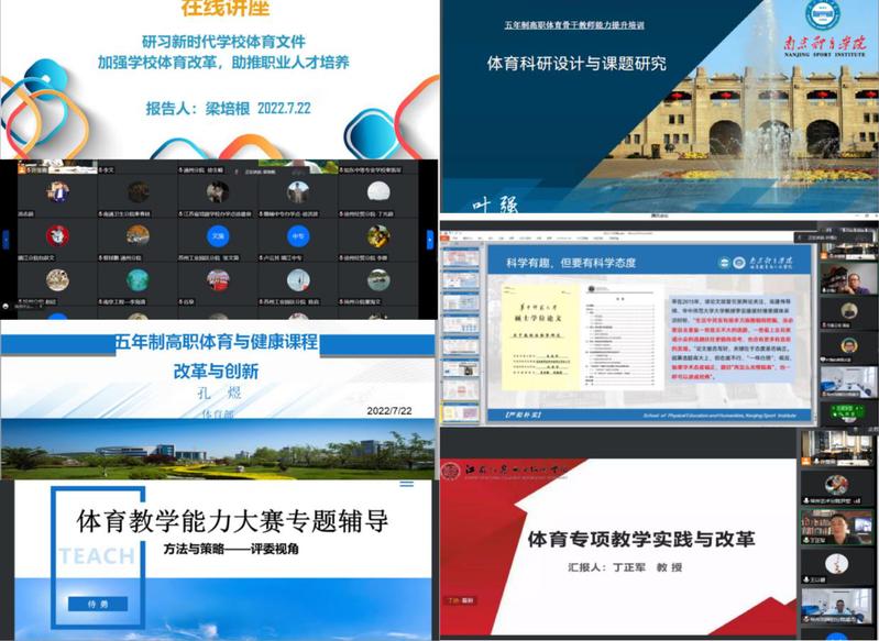 培训班上,邀请了梁培根、孔煜、侍勇、叶强和丁正军等五位来自高职院和本科院校的教授进行授课。他们分别从体育工作文件的解读、五年制高职体育与健康课程教学改革与创新、体育教师教学能力大赛专题辅导、体育科研设计与课题研究和体育专项教学实践与改革等五个方面做了精彩的报告。报告内容丰富,理实结合,干货满满,对参培教师能更好地开展五年制高职体育教育教学工作起到了切实有效的指导。