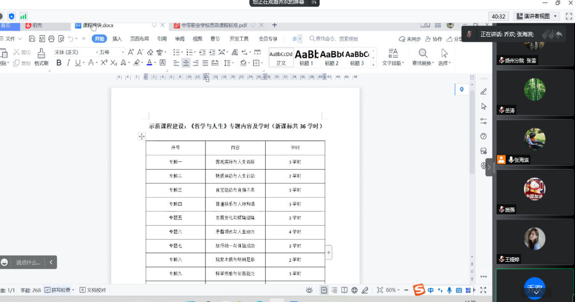 丰县中专办学点的岳涛老师就《哲学与人生》示范课程建设工作方案进行了解读,并耐心及时地回答与会老师提出的一些具体细节问题。大家通过沟通交流,对方案有了进一步深入的理解;相城中专乔欢老师就《哲学与人生》专题内容及学时问题进行了全面细致的分析,并且就学时问题和与会老师进行了深入的交流,最终达成一致意见。