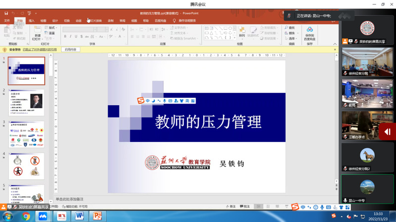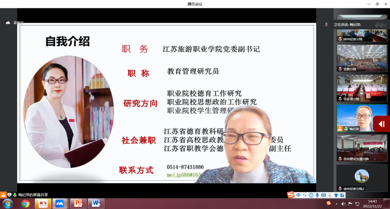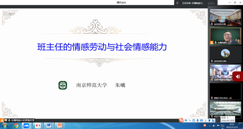 培训班邀请了江苏旅游职业学院梅纪萍副书记、南京师范大学班主任研究中心朱曦主任、苏州大学教育学院吴铁钧副院长分别以《班主任行为规范与职业素养》《班主任的情感劳动与社会情感能力》《教师的压力与管理》为题进行专家讲座。2021年班主任能力大赛省赛、国赛获得者陶都中专办学点奚凤老师、南京财经分院丁金凤老师和连云港中专办学点韩静老师分别以《和一群人共同成长》《班主任---不做建班育人之路的“孤勇者”》《治班有常 利生为本---智慧带班二三事》为题,交流分享了班主任工作和班主任大赛工作的经验和心得体会。