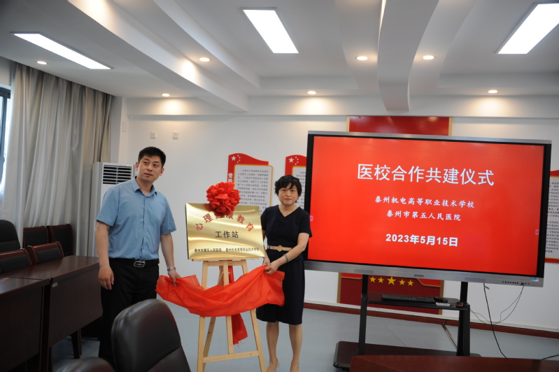 首先,张慧校长介绍了学校及心理工作开展的情况,对泰州市第五人民医院给予学校各方面的支持表示衷心感谢,希望双方将来能更好地进行深入合作。章冬梅副院长介绍了泰州市第五人民医院的基本情况、与学校具体的合作项目内容,表示会积极参与此次医校共建合作活动,也愿意更好地服务社会、履行社会责任。随后,双方共同在“医校合作”协议书上签字,为心理健康教育工作站揭牌,并为专家颁发了聘书。