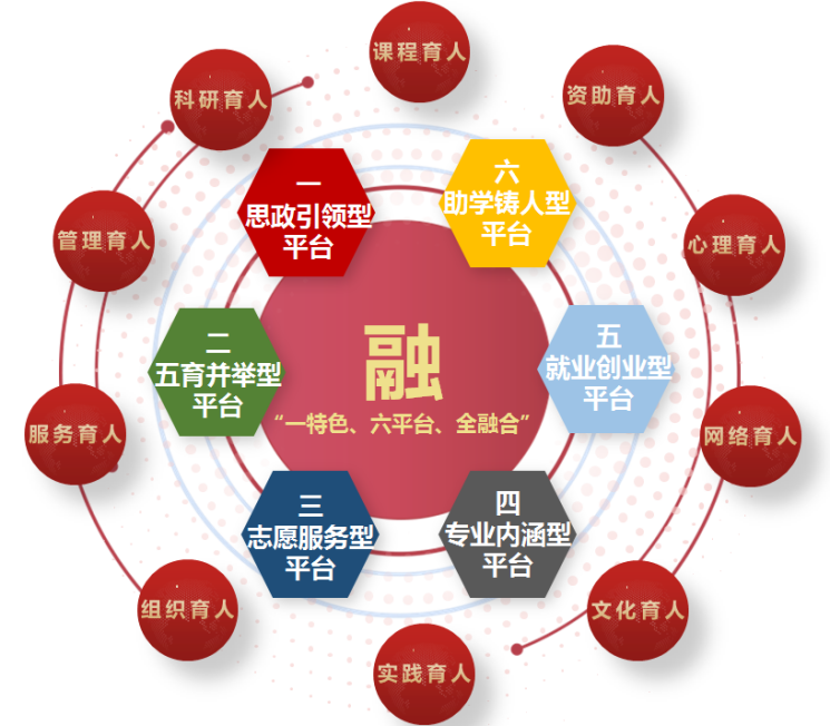 学校建立以第一课堂为主,课堂内外相互衔接,校内外相互融合,课程育人、科研育人、管理育人、服务育人、组织育人相互渗透,实践育人、文化育人、网络育人相得益彰,心理育人、资助育人解痛点的十大育人路径,实现“时间上无空档、空间上无死角、人员上无懈怠、内容上无遗漏”的目标。