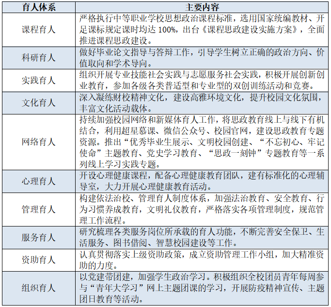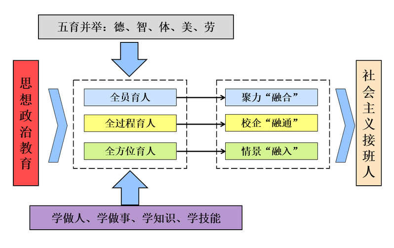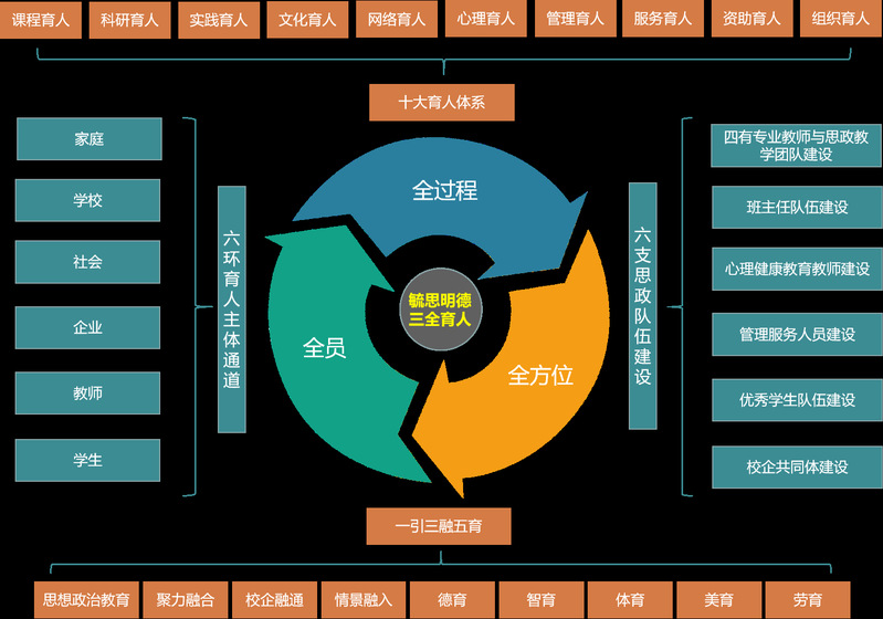 围绕“十大”育人体系建设,坚持将思想政治教育引领和贯穿教育教学全过程,通过聚力融合、校企融通、情景融入的 “三融”联动,德智体美劳“五育”并举,筑就具有鲜明职教特色的“三全育人”新格局。