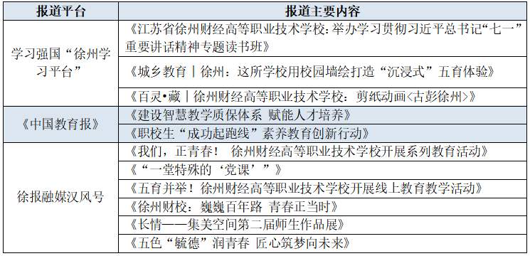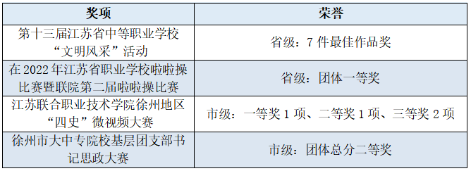 近年来,学校先后被评为“省中等职业学校领航计划建设单位”“省德育特色学校”“省职业学校德育工作先进校”“省职业学校学生管理30强”“省职业院校技能大赛先进单位”“市‘三全育人’典型学校”等荣誉。《一引三融五育 构筑三全育人新格局》工作案例入选江苏省职业院校“三全育人”典型案例;《“三方联动、五位一体”劳动教育实践》工作案例,入选江苏省职业院校劳动教育典型案例;《打造“毓德财苑”德育品牌 推进“三全育人”综合改革》工作案例,入选徐州市“三全育人”工作典型案例;《五色毓德润青春 匠心筑梦向未来》及《画笔下的一抹青春色彩》案例,入选徐州市德育特色案例。胡婷老师“毓德·守正”班主任工作室被评选为2022年江苏省中等职业学校班主任工作室立项建设项目和徐州市中等职业学校班主任工作室培育建设对象。
