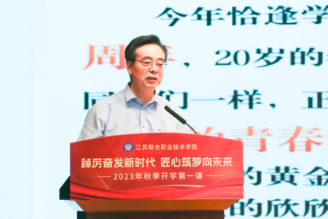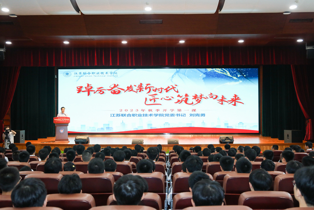 秋意渐浓,丹桂飘香。为进一步落实立德树人根本任务,引导五年制高职新生扣好“人生第一粒扣子”,为学生成长奠定良好的基础。922日下午,学院党委书记刘克勇以“踔厉奋发新时代 匠心筑梦向未来”为题,为全院6.5万名2023级新生讲授开学第一课。本次讲课地点设在南京分院礼堂,学校近400名师生在现场聆听,其余办学单位通过江苏电视台教育频道和南京电视台教科频道在线收看网络直播。