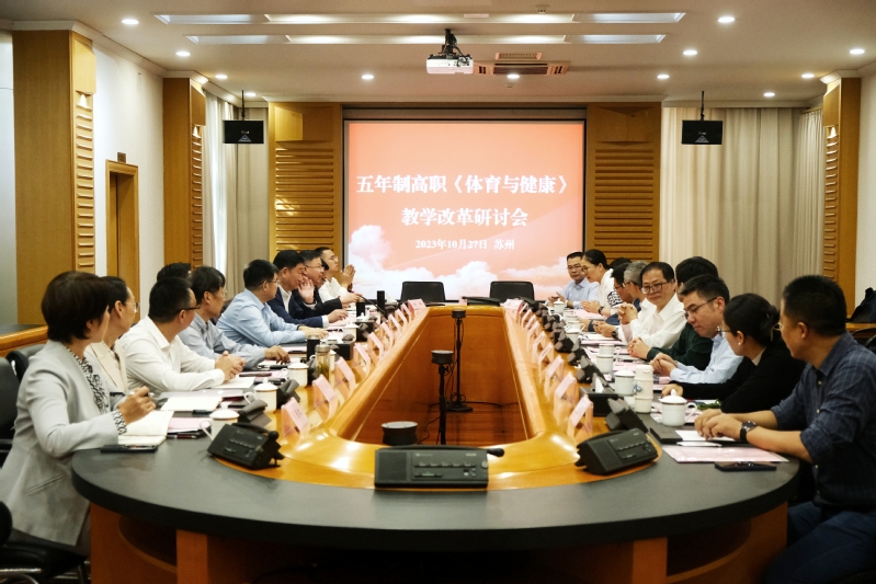 2023年10月27日下午,江苏联合职业技术学院五年制高职《体育与健康》教学改革研讨会在苏州大学召开。江苏联合职业技术学院党委书记刘克勇、院长王伟、副院长徐伟、原副院长陶向东,江苏省体育产业集团有限公司总经理吴波、副总经理田奎,省职教学会体卫艺工作委员会主任、玄武中专办学点校长孙兵,省学生体协职业学校工作委员会副秘书长戴国红,苏州大学出版社社长盛惠良、总编辑陈兴昌,高等教育出版社中职事业二部主任王素霞、文科分社分社长董梦也,学院体指委主任委员、无锡交通分院校长李进等领导、专家共20余人参加会议。会议由徐伟副院长主持。