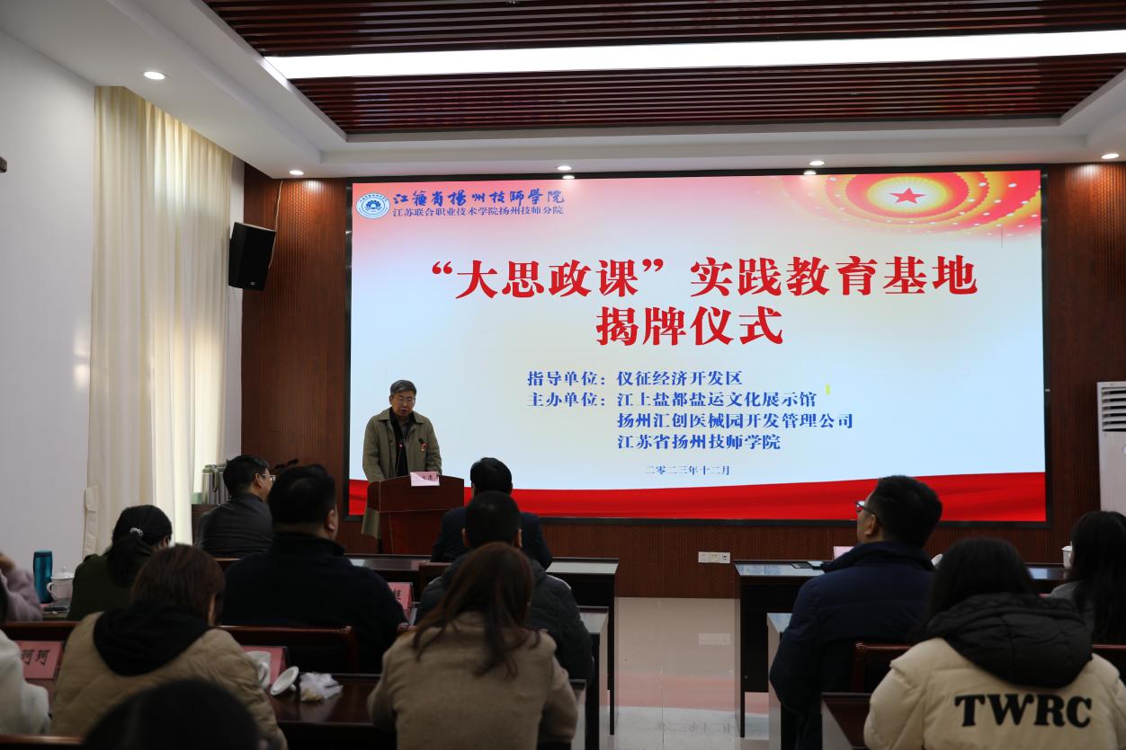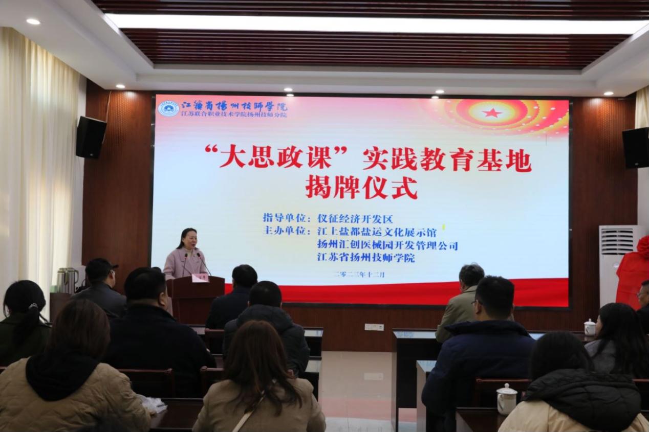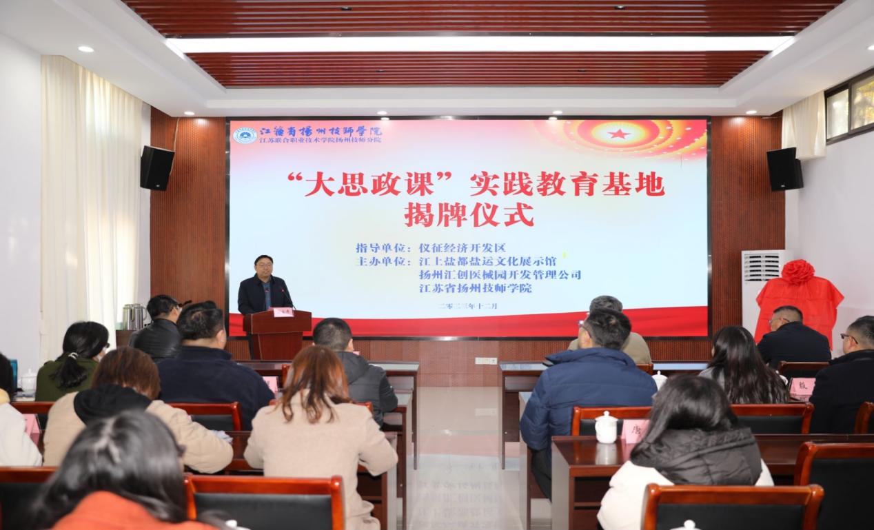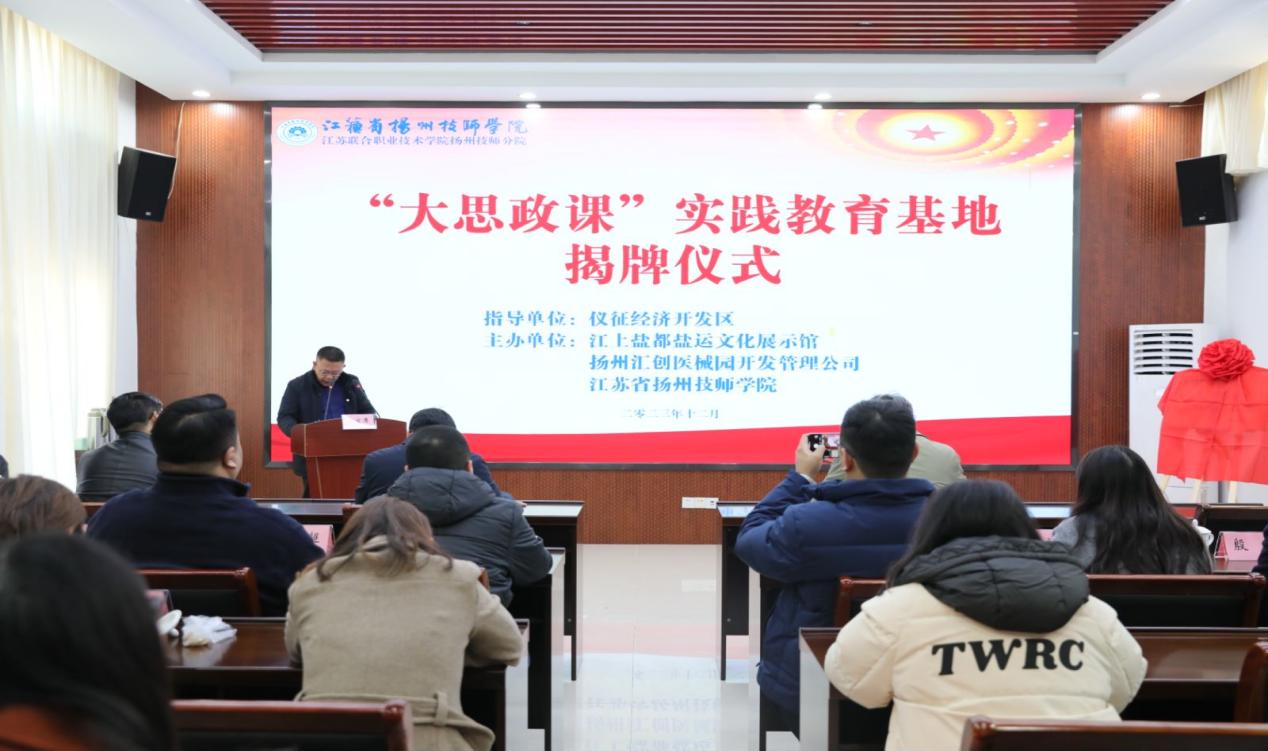 为深入贯彻落实习近平总书记关于“大思政课”的重要指示批示精神,推进“大思政课”教育走深走实,增强践行新的文化使命的责任担当。12月1日上午,扬州技师分院“大思政课”实践教育基地揭牌仪式在仪征市十二圩江上盐都盐运文化展示馆举行。扬州技师分院党委副书记王思源,仪征经济开发区党委委员、新城镇党委书记郭猛,新城镇党委副书记、镇长潘天宏,扬州汇创医械园开发管理公司副总经理陶伯虎出席了本次活动。仪征经开集团党委委员、副总经理、江上盐都盐运文化展示馆馆长金小平,扬州技师分院党委委员、组织部部长汪明星,各党总支代表、基础部思政课教师代表及扬州汇创医械园开发管理公司职工代表参加了活动。活动由基础部(马克思主义学院)承办,基础部主任、马克思主义学院院长王新文主持揭牌仪式。