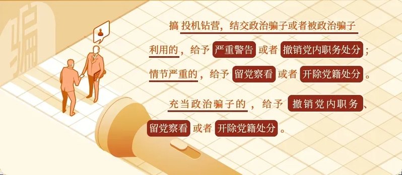 新修订的《中国共产党纪律处分条例》明确增写了搞投机钻营,结交政治骗子或者被政治骗子利用,以及党员充当政治骗子的处分规定。