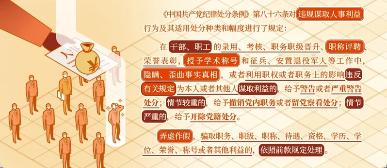 在干部、职工的录用、考核、职务职级晋升、职称评聘、荣誉表彰,授予学术称号和征兵、安置退役军人等工作中,隐瞒、歪曲事实真相,或者利用职权或者职务上的影响违反有关规定为本人或者其他人谋取利益的,给予警告或者严重警告处分;情节较重的,给予撤销党内职务或者留党察看处分;情节严重的,给予开除党籍处分。
