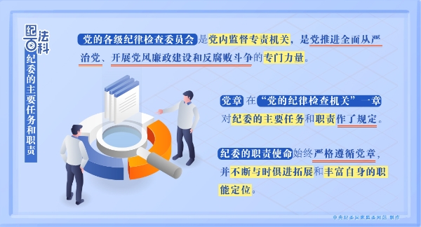 2021年,中共中央发布《中国共产党纪律检查委员会工作条例》,《条例》第三条规定,党的各级纪律检查委员会的主要任务是:维护党的章程和其他党内法规,检查党的理论和路线方针政策、党中央决策部署执行情况,协助党的委员会推进全面从严治党、加强党风建设和组织协调反腐败工作。《条例》第四章、第五章分别以专章的形式对党的各级纪律检查委员会的主要任务、工作职责作出具体规范。