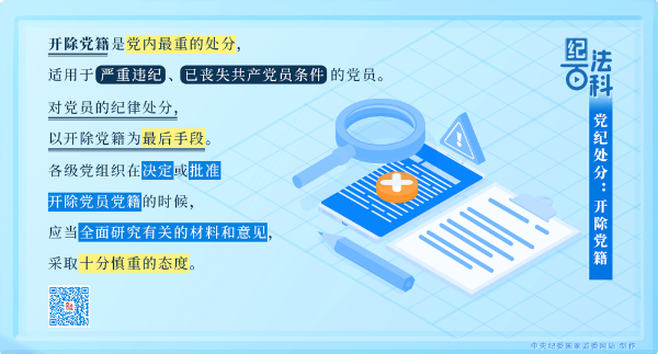 开除党籍是党内最重的处分,适用于严重违纪、已丧失共产党员条件的党员。对党员的纪律处分,以开除党籍为最后手段。各级党组织在决定或批准开除党员党籍的时候,应当全面研究有关的材料和意见,采取十分慎重的态度。
