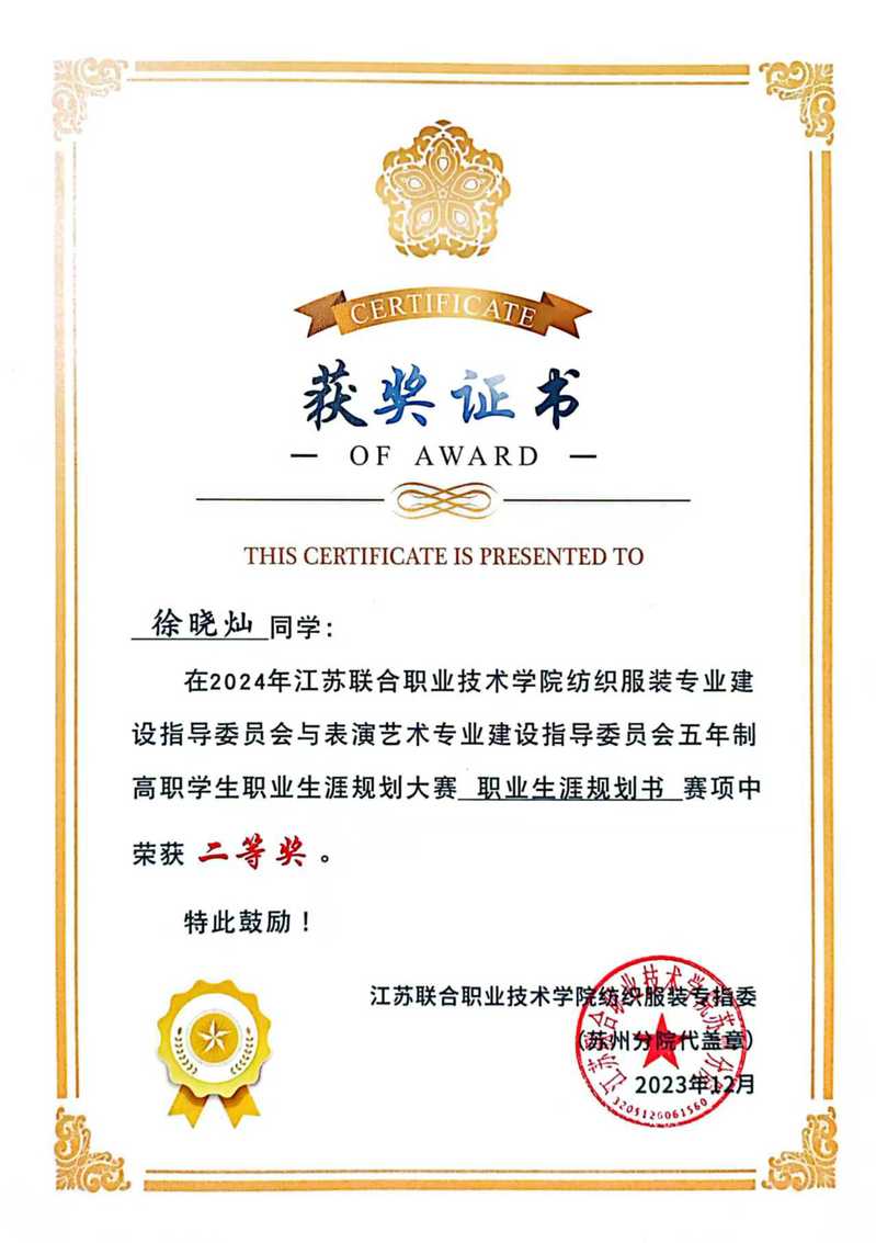在五年的学习生涯中,徐晓灿脚踏实地,凭借不懈的努力,在老师的指导下,取得了丰硕的成果。她多次荣获市级、区级、校级“三好学生”“优秀班干部”“优秀志愿者”等荣誉称号。她如同一颗璀璨的新星,照亮了自己前行的道路,也激励着身边的每一个人。她用自己的实际行动讲述了职校生通过努力拼搏成为一个有理想、敢担当、能吃苦、肯奋斗的新时代好青年的生动故事。