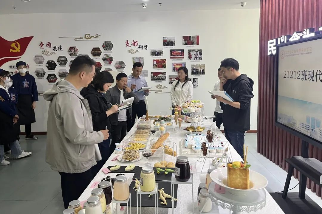 据悉,本次现代学徒制项目采用“工学交替”培养模式,分为两个培养阶段。第一阶段组织安排学生进入沪耀公司生产一线,在企业导师指导下进行岗位实操学习;第二阶段在校内开展整周实训,由学校烹饪专业教师指导学员开展技能提升与创新实践。最后的总结活动,学校特别设置了学生作品展示环节,并创新引入“家校企”三方联合评价机制。学生详细介绍自己精心制作的各式面点、糕点,“家校企”专家从色泽、造型、口感、营养等方面进行点评,进一步深化了现代学徒制的内涵。