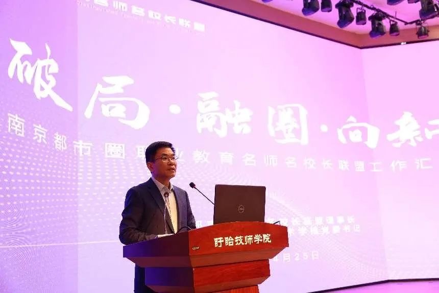 南京都市圈名师名校长联盟理事长、金陵分院党委书记周乐山代表联盟作工作汇报。2023年3月南京都市圈职教名师名校长联盟正式成立,联盟以“建设跨区域都市圈职教联盟典范”为目标,融圈建链,织密“资源共享链”、形成“校际协同链”、夯实“师资培养链”,携手同行、盎然向新,将职业教育AI心理关爱、低空经济、融媒体等优质人才培养项目融入都市圈区域,以服务再服务为基,共赴职教新蓝海。