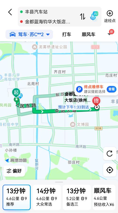 自驾路线:徐州东站—金都蓝海钧华大饭店(徐州丰县飞龙湖店)