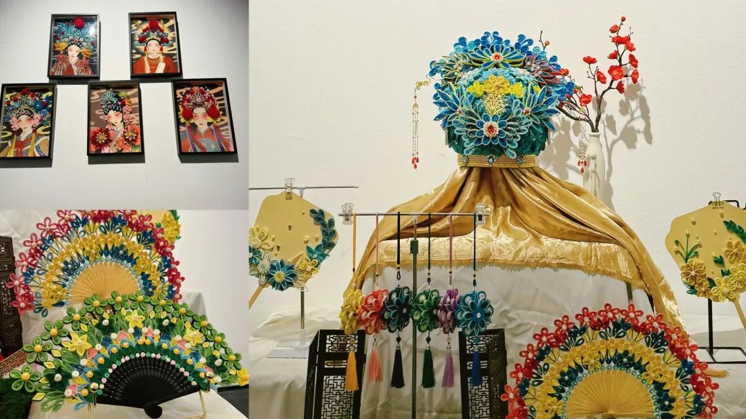 展览现场,学院党委委员、副院长郭偌伶,美育课程指导委员会副主任委员、江苏模特艺术学校副校长王明志,徐州财经分院党委委员、纪委书记、副校长董夙慧与创作者张雪窈亲切交流。在了解到作品历时五个月、历经多轮修改才最终完成后,郭偌伶副院长表示,这种精益求精的创作态度,以及对非遗技艺的传承与创新,正是职业教育技能与素养并重育人理念的生动体现。张雪窈同学分享了她的创作心得:“我利用课余时间研究经典戏曲剧目影像,搜集了百余张剧照中的花纹与色彩元素,尝试将戏曲的影像语言与衍纸的工艺技法融合。作为广告艺术设计专业的学生,我在衍纸艺术的美学表达中找到了专业与艺术的共鸣,也更加深刻地体会到‘美育浸润行动’的深远意义。”