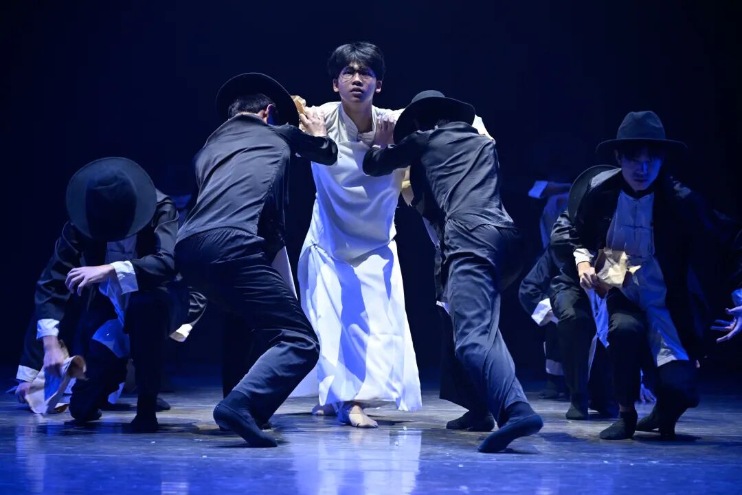 22级学生汤文博在排练《永远的青年——致瞿秋白的歌》时,曾因一个高难度的“上肩”动作配合失误而摔落。“那次之后腰疼了很久,”他回忆,“但在老师帮助下我们优化了动作细节,最终攻克了这个难关。”为了塑造好“瞿秋白”这一角色,他主动查阅史料、观看纪录片,力求在舞台上传递出革命先辈的精神内核。