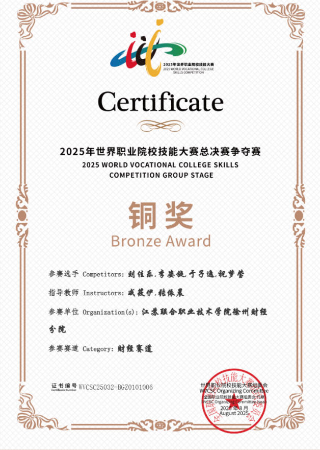 【人物简介】刘佳乐,徐州财经分院会计系大数据与会计专业五年一贯制2021级高职学生。成绩名列前茅,凭借扎实功底考取初级会计资格证,积极投身志愿服务,累计服务72小时,曾获2024年度学院三好学生称号;2025年世界职业院校技能大赛总决赛“财经赛道”高职组铜奖、2025年江苏省职业院校技能大赛会计实务赛项(高职组)一等奖、2025年江苏省职业院校技能大赛(高职组)学院选拔赛会计实务竞赛项目(学生赛)一等奖。