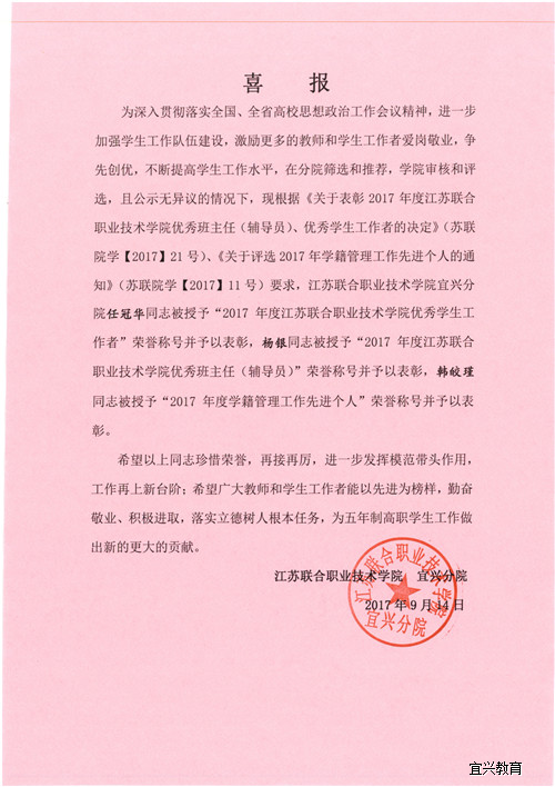 为深入贯彻落实全国、全省高校思想政治工作会议精神,进一步加强学生工作队伍建设,激励更多的教师和学生工作者爱岗敬业,争先创优,不断提高学生工作水平,在分院筛选和推荐,学院审核和评选,且公示无异议的情况下,现根据《关于表彰2017年度江苏联合职业技术学院优秀班主任(辅导员)、优秀学生工作者的决定》(苏联院学【2017】21号)、《关于评选2017年学籍管理工作先进个人的通知》(苏联院学【2017】11号)要求,江苏联合职业技术学院宜兴分院任冠华同志被授予“2017年度江苏联合职业技术学院优秀学生工作者”荣誉称号并予以表彰,杨银同志被授予“2017年度江苏联合职业技术学院优秀班主任(辅导员)”荣誉称号并予以表彰,韩皎瑾同志被授予“2017年度学籍管理工作先进个人”荣誉称号并予以表彰。