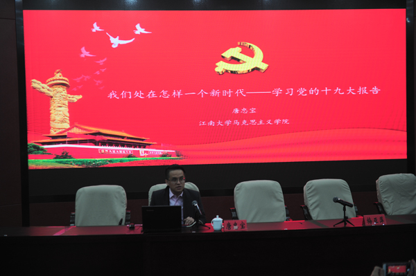 颁奖仪式过后,江南大学马克思主义学院副教授唐忠宝应邀为全体党员作十九大精神专题讲座。他以“我们处在怎样一个新时代”为主题,从新主题、新时代、新矛盾、新思想、新目标、新使命、新方略、新举措等八个方面深入解读党的十九大报告精神。唐教授的讲座旁征博引,内容丰富,分析深刻,语言幽默,引发与会同志深入思考。