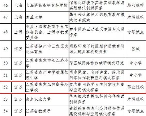 根据教育部公布的《教育部关于第一批教育信息化试点验收结果的通报》(教技函[2017]77号)文件,确定全国161个试点优秀单位,其中职业院校35个,南京工程分院是江苏省唯一的职业院校优秀试点单位。