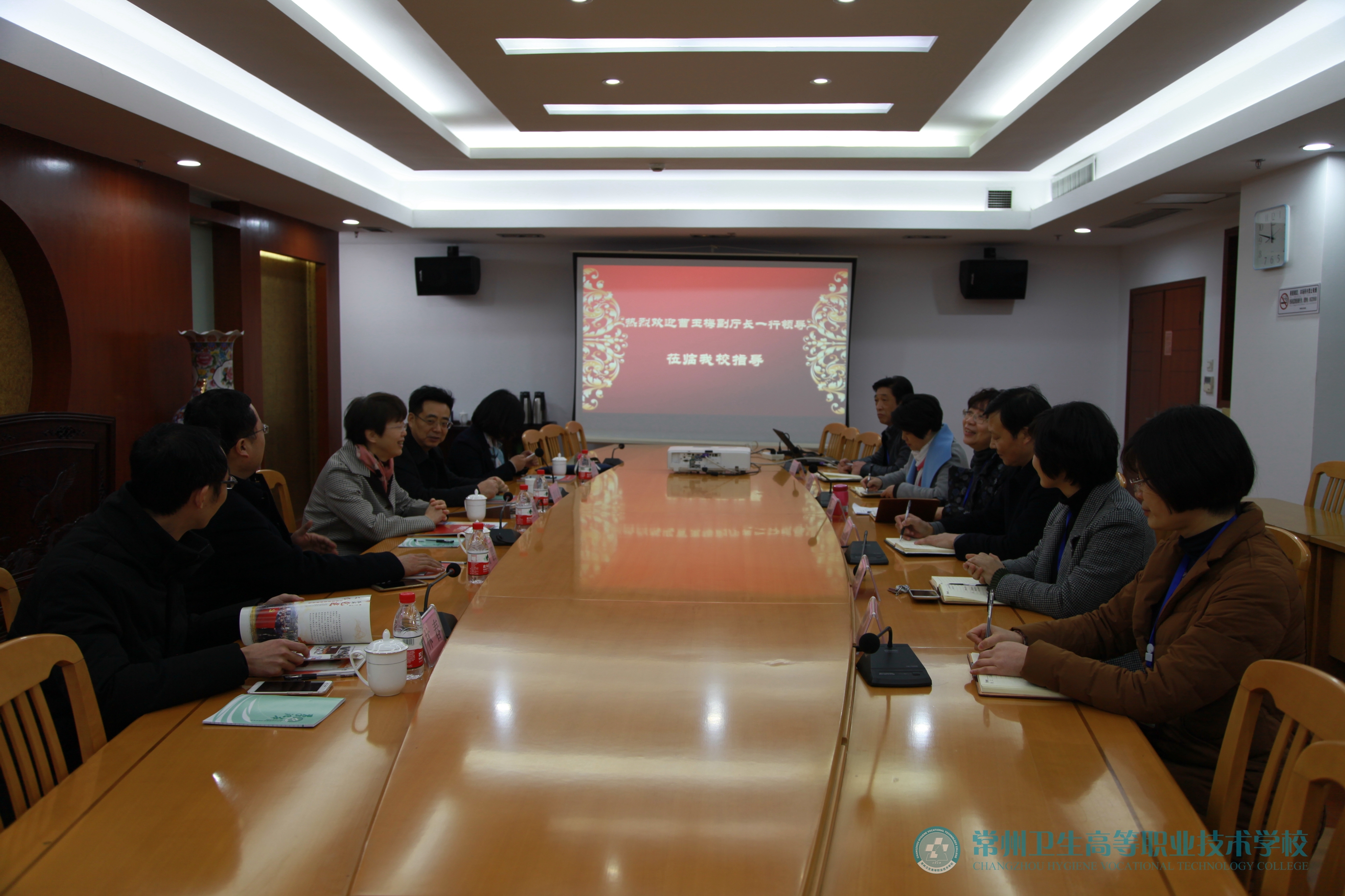 随后,曹玉梅副厅长与学校班子成员等同志进行了亲切的会谈。胡鹏副局长向厅领导介绍了常州卫生分院的办学情况,表示学校的办学品质高、内涵发展好、专业特色强,为常州职业教育增光添彩。曹玉梅副厅长充分肯定了学校取得的成绩,表扬学校管理规范、精致温馨,同时对学校未来的发展提出了新的要求:希望学校顺应社会发展需求,提高办学质量,在内涵和外延发展上有更好的拓展;希望进一步在服务健康江苏、健康常州的建设中发挥更好的作用;按照省、市卫计委的部署和学校自身发展的需求,做好学校长远发展规划,同时关注教师专业成长,省教育厅将一如既往地关心、支持学校的发展!