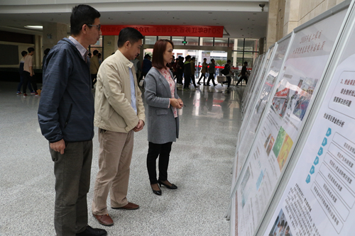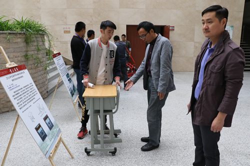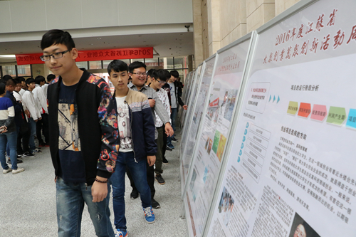 启动仪式结束后,师生代表们参观了学校“双创”活动的宣传展板,了解了学生创新创业的政策、法规、程序、途径,并欣赏了思维智能代步车、便移可锁省空间教学桌椅机、多功能手工成形降噪抗震工作台等创新创业大赛参赛作品。