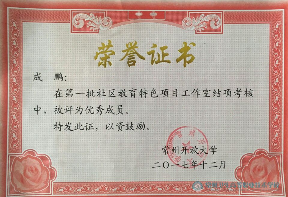 12月12日下午,在常州开放大学开展了第一批社区教育特色项目工作室终期结项考核,经过材料考查、结项汇报、专家评审等环节,共评选出优秀工作室6个、优秀成员9位,常州卫生分院领衔的《社区居民健康教育与促进》特色项目工作室喜获优秀,成鹏老师被评为优秀成员。