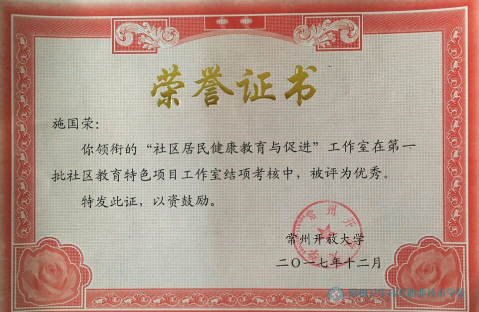 常州卫生分院领衔的《社区居民健康教育与促进》特色项目工作室,自2015年4月立项以来,依据《常州开放大学社区教育特色项目工作室建设方案》(常开大[2015]1号)要求,在师资队伍建设、社区教育课程资源开发、社区教育课程的实施、开展社区教育研究、开展项目实验、进行网上推广与应用、加强媒体宣传等诸方面,积极推进,成效显著。