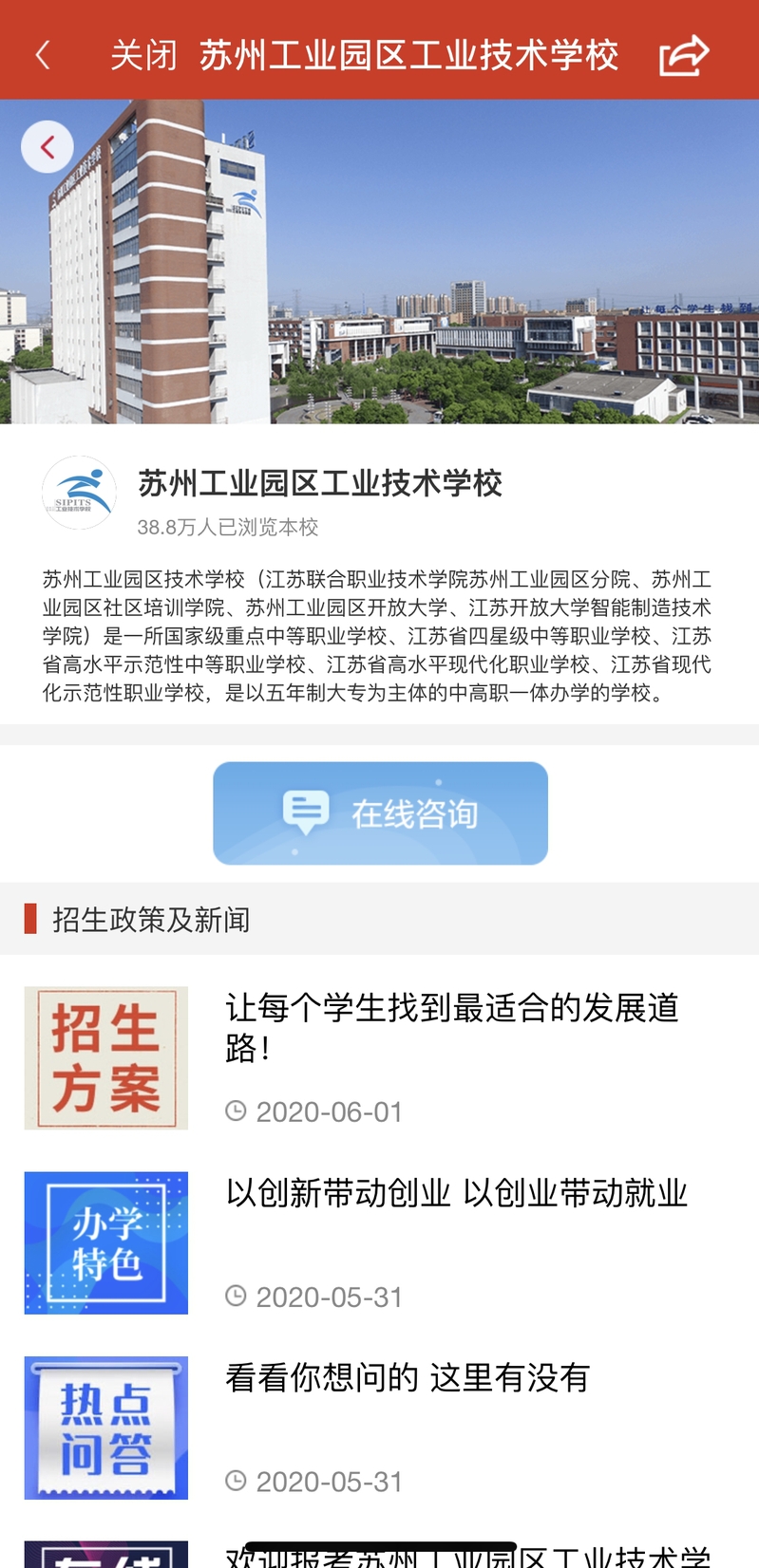 近几年,苏州工业园区分院五年制高职生源质量逐年提高,“让每个学生找到最适合的发展道路”这一理念得到家长们的认可和赞赏。据引力播平台数据显示,截止目前分院共有38.8万的浏览数,在苏州市的职业学校中位列第一,电话及线上咨询人数近千人。集中咨询活动已结束,后续分院仍将通过云端、微信、电话等形式为广大家长和考生们答疑解惑。