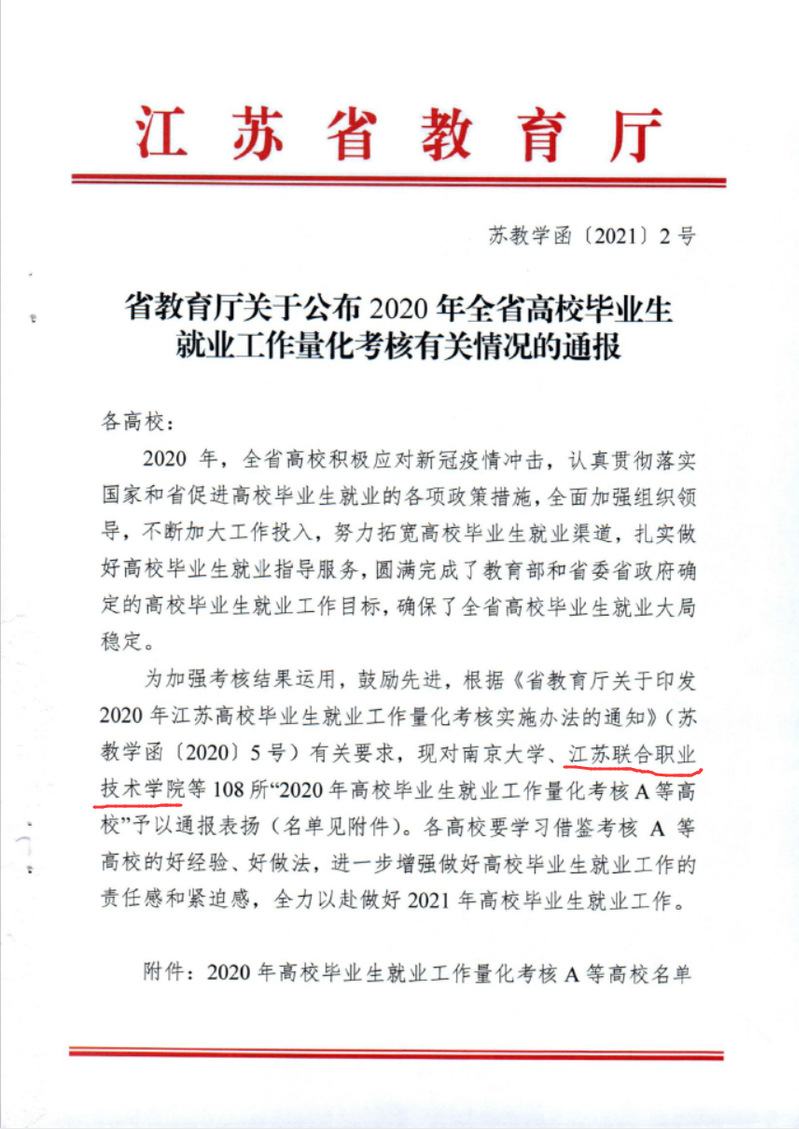 近日,江苏省教育厅发布《关于公布2020年全省高校毕业生就业工作量化考核有关情况的通报》(苏教学函〔2021〕2号),我院荣获2020年全省高校毕业生就业工作量化考核A等次。
