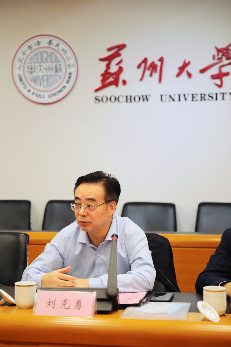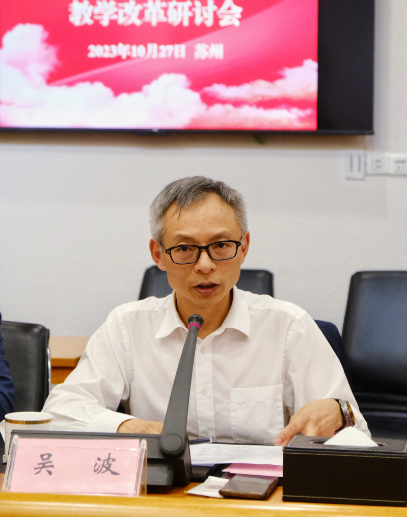 苏州大学出版社盛惠良社长致欢迎辞,他表示会按照学院工作部署和高等教育出版社共同服务好学院的教材编写出版工作。