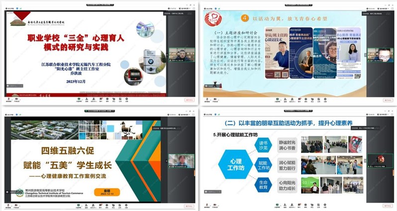 培训班上,南京师范大学心理学院党委书记周红、徐州经贸分院教授刘翠英分别以《转危为机——谈谈心理危机事件中的沟通》《基于积极心理学的五年制高职心理健康教师的自我成长》为主题作讲座,无锡汽车工程分院乔洪波、南京工程分院徐奇、常州旅游商贸分院秦曙、昆山第一中等专业学校办学点梅娟等学生工作部门负责人和老师分享了五年制高职学生心理健康教育典型案例。专家讲座和经验分享全方位、多层面引导广大教师坚持育人、育才、育心相统一,为推进构建“以德育心、以智慧心、以体强心、以美润心、以劳健心”的学生“五育”成长闭环和共同守护学生心理健康提供了理论依据和实践指导。