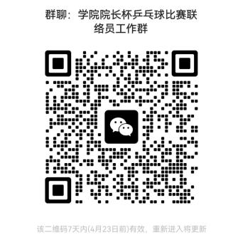 1.请各队联络员扫描二维码加群“第十七届院长杯乒乓球比赛联络员工作群”,便于工作协同。加群后请修改为“××分院(办学点)+本人实名”;