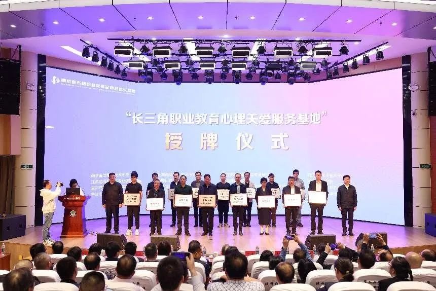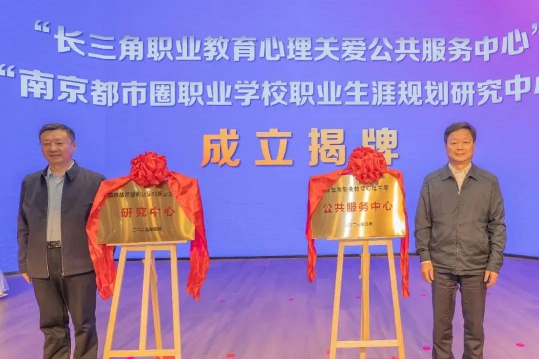 长三角职教心理研究中心主任张建红和南京市教育局职社处处长、一级调研员黄子亮共同为长三角职业教育心理关爱公共服务中心和南京都市圈职业学校职业生涯规划研究中心揭牌。
