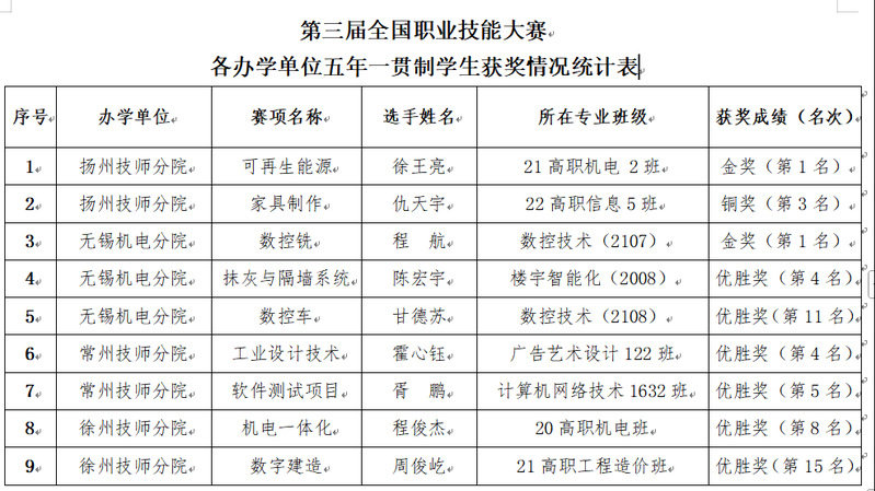 2025年9月19日至23日,被誉为中国技能界“全运会”的中华人民共和国第三届职业技能大赛在郑州举行。本届大赛以“技能照亮前程”为主题,设置106个竞赛项目,汇集全国3420名技能精英。江苏联合职业技术学院学子在此次国家级顶尖赛事中表现出色,取得了2项金奖、1项铜奖和6项优胜奖的优异成绩。