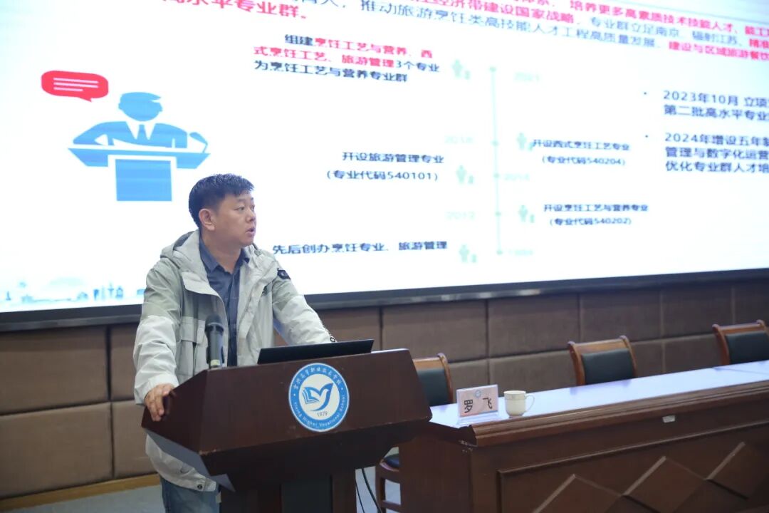 在专业建设交流环节,南京商贸分院罗飞、镇江分院庄惠、扬州旅游商贸学校办学点蒋丹丹、宜兴分院谈锋、无锡旅游商贸分院秦炳旺五位老师,分别就烹饪工艺与营养专业群、旅游管理专业群、咖啡文化产业学院、现代学徒制等项目分享了建设经验与实践反思。
