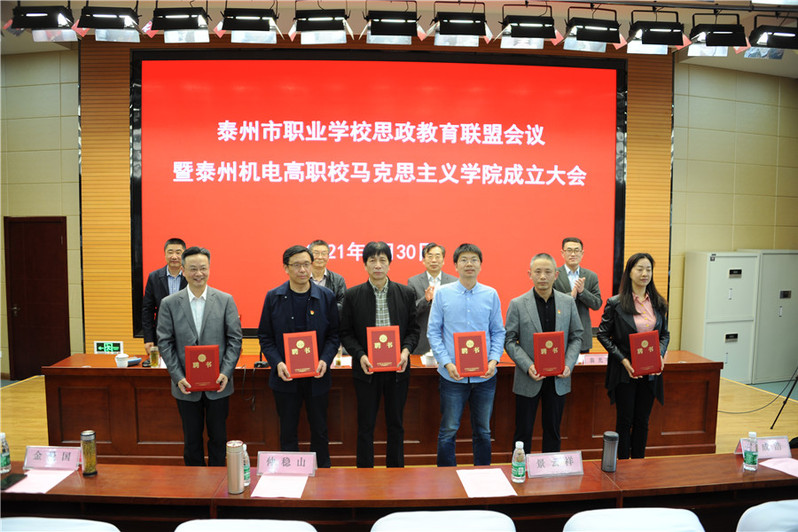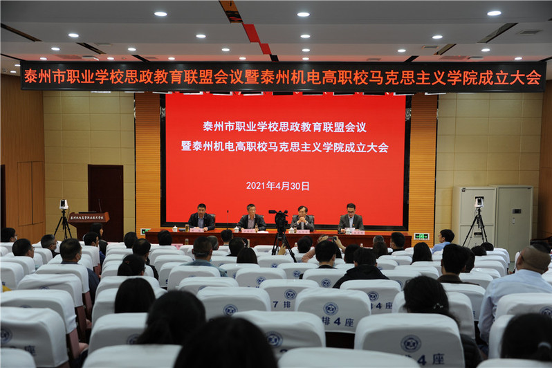 4月30日下午2点30分,泰州市职业学校思政教育联盟工作会议暨我校马克思主义学院成立大会在我校报告厅胜利召开,学校党委书记、校长翁光明主持会议。省职教学会领导、江苏联合职业技术学院领导、市教育局领导、市委党校领导、市司法局领导、泰州学院领导、省社科院泰州分院领导、江苏农牧科技职业学院领导、泰州职业技术学院领导、各市(区)教育局职能科室负责人、市家校共同发展委员会领导、泰州市各职业学校分管学生工作的副校长、学工处处长、团委书记、政治教研组负责人、班主任、合作企业领导等各界代表与会。