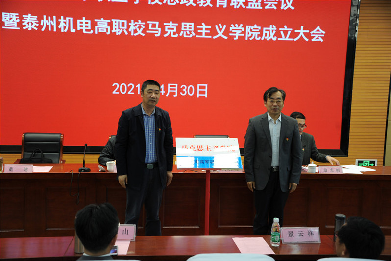 大会第三项议程:江苏联合职业技术学院副院长陶向东同志和泰州市教育局副局长董健同志为泰州机电高职校马克思主义学院揭牌。