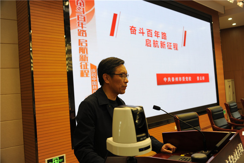 大会第八项议程,马克思主义学院“红色匠心”讲坛第一讲。泰州市委党校景云祥副校长以《奋斗百年路,启航新征程》为题,从奋斗史:实现中国梦、探索史:探寻中国路、党建史:锻造使命党三个方面作了党史教育专题报告。全体学生在班级教室观看了视频直播。