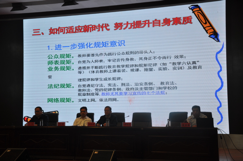 讲座中,党委委员、副校长唐维志围绕新时代的教育方针和教育理念、新时代的教师应该具备怎样的师德素养、教师如何适应新时代要求努力提升自身素养三个方面展开。带领全体教职工再次学习了《新时代中小学教师职业行为十项准则》,并对全体教师从爱岗敬业、为人师表、关爱学生等方面的行为提出了具体的要求。党委书记、校长刘波结合教学处问卷调查的实际情况,并以此要求全体教师要增强纪律意识,自尊自爱,坚持教学六认真,并提出制定《师德师风负面清单报告制度》;殷切希望每位教职工以创建江苏省联合职业技术学院泗阳中专分院为契机,以优良的师德师风带动教风、促进学风,推动学校教育事业发展。